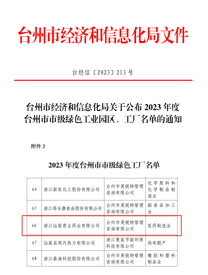 11月17日,臺州市經(jīng)濟(jì)和信息化局公布2023年度臺州市市級綠色工業(yè)園區(qū)、工廠名單,君業(yè)藥業(yè)榮獲“市級綠色工廠”榮譽(yù)稱號。