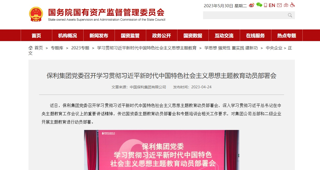 今年是深入學習貫徹黨的二十大精神的開局之年,開局之年以主題教育開篇,節(jié)點特殊,意義深遠。下一步,保利集團將持續(xù)貫徹黨中央和國資委黨委部署要求,錨定新時代新征程上的保利定位,聚焦加快建設世界一流的使命任務,在學習貫徹落實習近平新時代中國特色社會主義思想中汲取砥礪奮進的智慧力量,以主題教育成色檢驗發(fā)展成色,奮力譜寫中國式現(xiàn)代化的保利篇章。