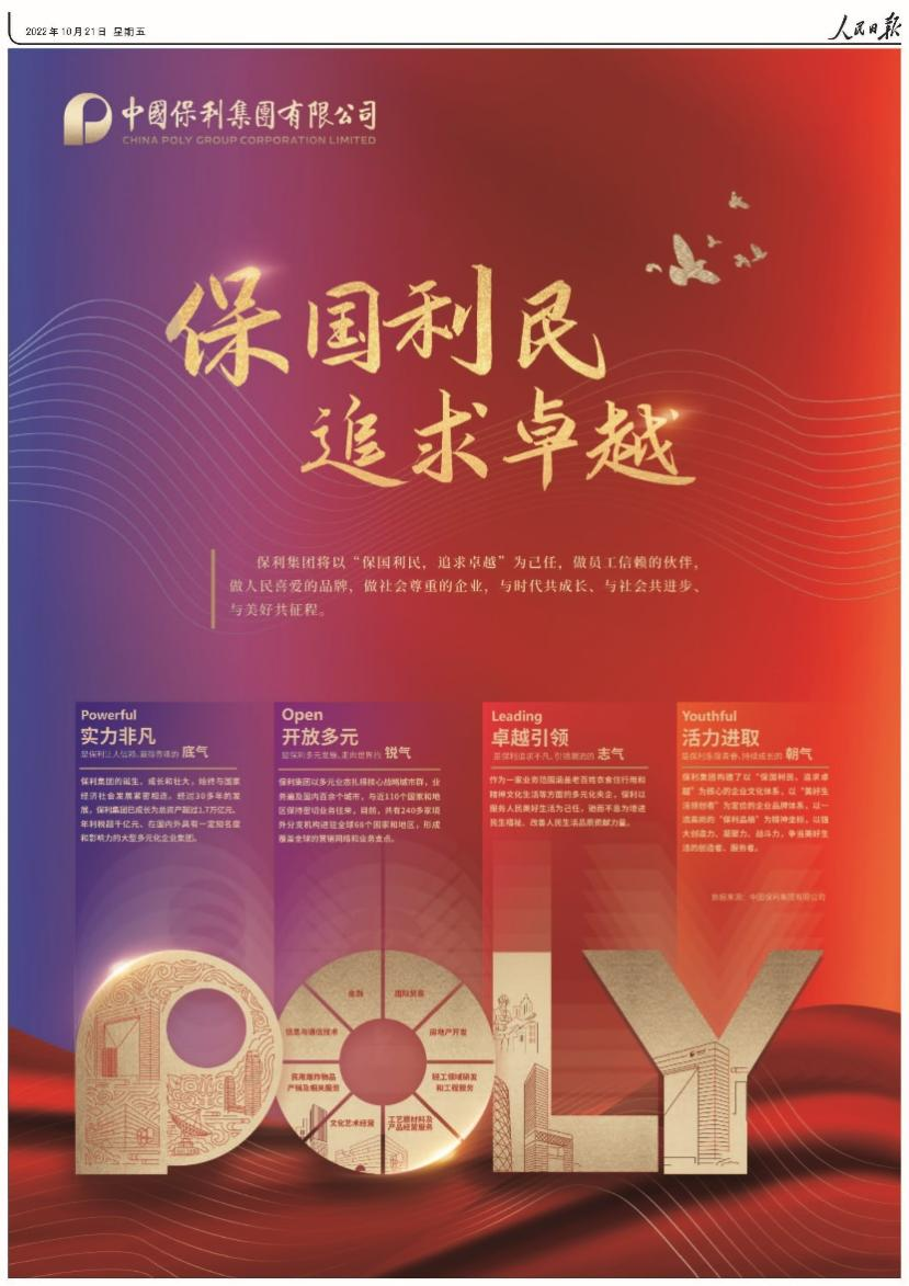 10月21日,《人民日報》專版聚焦保利集團。整版內容展示了保利集團“POLY”的品牌文化理念和“保國利民,追求卓越”的初心使命,以下為全文。