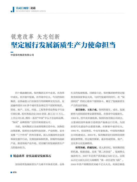 近日,《國資報告》雜志刊發(fā)保利集團署名文章《銳意改革 矢志創(chuàng)新 堅定履行發(fā)展新質(zhì)生產(chǎn)力使命擔(dān)當》,展現(xiàn)保利深入實施國有企業(yè)改革深化提升行動,推動傳統(tǒng)產(chǎn)業(yè)轉(zhuǎn)型升級和戰(zhàn)新產(chǎn)業(yè)發(fā)展,切實履行好發(fā)展新質(zhì)生產(chǎn)力的使命擔(dān)當。與大家分享——
