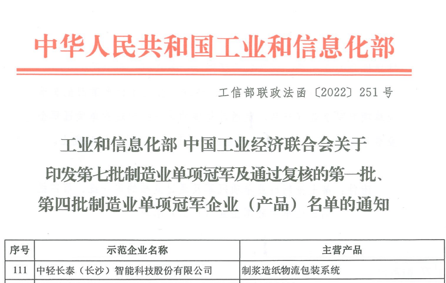 近期,保利中輕下屬中輕長泰(長沙)智能科技股份有限公司(簡稱“中輕長泰”)憑借國際領(lǐng)先的制漿造紙物流包裝系統(tǒng)產(chǎn)品被工業(yè)和信息化部等認(rèn)定為制造業(yè)單項冠軍示范企業(yè),體現(xiàn)出國家、行業(yè)對中輕長泰在制漿造紙行業(yè)智能制造實(shí)力的高度肯定。