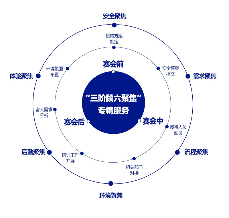 由保利商旅打造的“三階段六聚焦”專精服務(wù)模式,圍繞賽會(huì)前、中、后三大階段,做好安全聚焦、需求聚焦、流程聚焦、環(huán)境聚焦、后勤聚焦、體驗(yàn)聚焦。在接待方案制定、安全預(yù)案提交、接待人員動(dòng)員、相關(guān)部門對(duì)接、培訓(xùn)工作開(kāi)展、客人需求分析及環(huán)境氛圍布置七大方面,全方位保障重大任務(wù),力求實(shí)現(xiàn)“高峰會(huì)服”的專業(yè)、高效、安全、體貼。